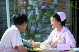 10月4日,黃埔古村,護士在義診中為市民量血壓。 廣州日報記者王燕攝