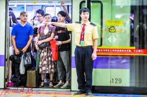 10月7日,地鐵工作人員在站臺上維持秩序。廣州日報記者陳憂子攝