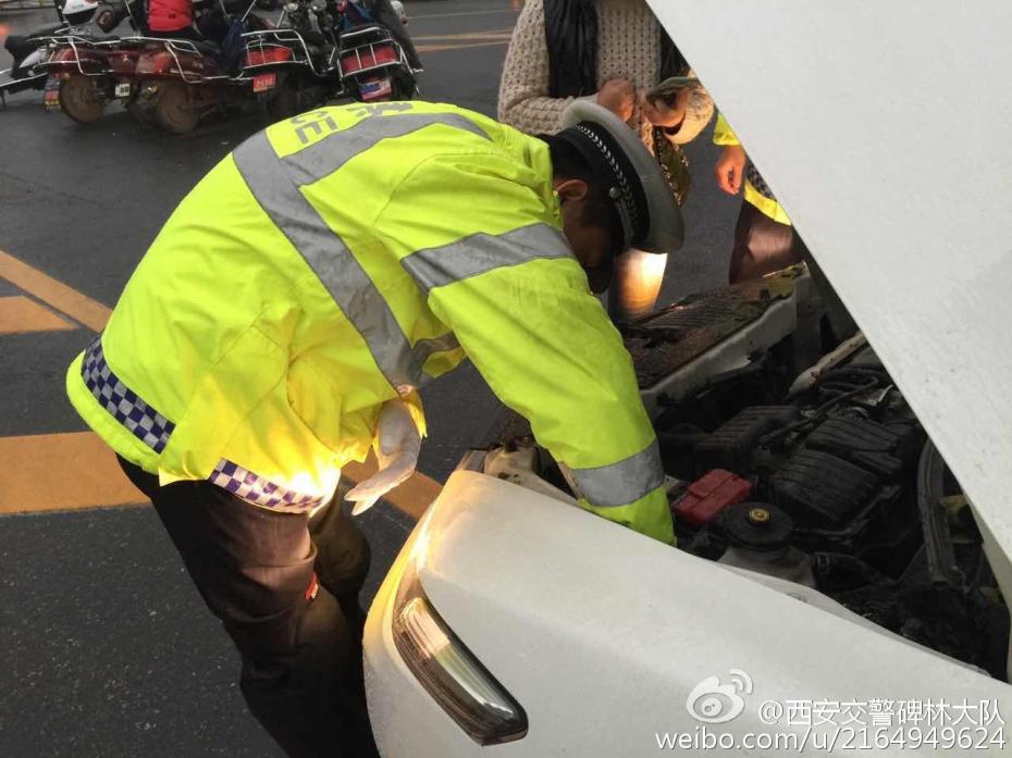 近日,一輛小轎車停到西安南門內盤道,司機說一路上聽見車里好像有貓的叫聲。(圖片來源:西安市公安局交通警察支隊碑林大隊官方微博)