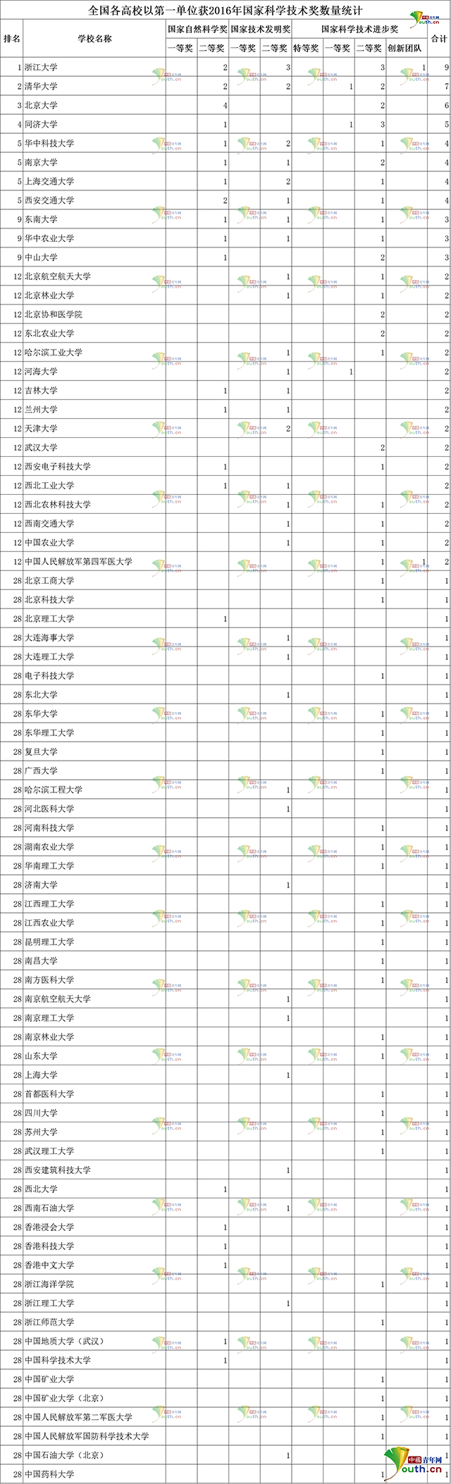 據(jù)中國青年網(wǎng)統(tǒng)計(jì),133所獲獎高校中有75所高校作為第一完成單位獲獎,其中,浙江大學(xué)有9個獎項(xiàng),位居第一;清華大學(xué)(7個)和北京大學(xué)(6個)分列第二位和第三位;同濟(jì)大學(xué)(5個)、華中科技大學(xué)(4個)、南京大學(xué)(4個)、上海交通大學(xué)(4個)、西安交通大學(xué)(4個)、東南大學(xué)(3個)、華中農(nóng)業(yè)大學(xué)(3個)、中山大學(xué)(3個)等8所高校也進(jìn)入前十名。