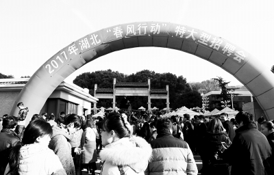 昨天上午,暖陽照耀下的武昌丁字橋施洋公園內(nèi)人頭攢動(dòng),近萬求職者擠爆2017湖北省春風(fēng)行動(dòng)大型招聘會(huì)現(xiàn)場。繼農(nóng)民工正月初八就返漢搶?shí)徍,大學(xué)生求職者正月十五開始涌現(xiàn)。