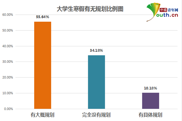 根據(jù)中國青年網(wǎng)記者調(diào)查顯示,對寒假生活有具體規(guī)劃和有大概規(guī)劃的人數(shù)分別為56人、296人,占總?cè)藬?shù)的的10.18%和55.64%;完全沒有規(guī)劃的人數(shù)為188人,占調(diào)查人數(shù)的34.18%。