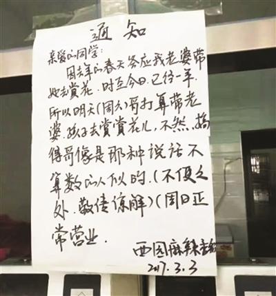 今年3月7日,多名該院同學(xué)在網(wǎng)上發(fā)布的一則趣聞,引大量網(wǎng)友關(guān)注:該校食堂一麻辣香鍋大廚一年半來,先后貼出的4張暫停業(yè)通知單,連成了一條“人生贏家之路”。4張停業(yè)通知分別是:2015年中秋因回家相親停業(yè)一天、因中秋相親失敗圣誕期間再相親停業(yè)兩天、去年底因老婆臨產(chǎn)停業(yè)三天、今年3月初帶老婆孩子去看花停業(yè)一天。相較平日常見的“因故停業(yè)”通知,這些通知頗顯另類。