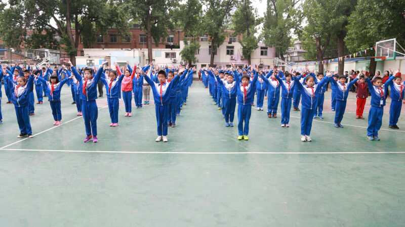 課間操展示活動中,主要由學(xué)生展示國家規(guī)定的《希望風(fēng)帆》、《七彩陽光》兩套廣播體操和師生自主編創(chuàng)的《健康歌》、《水果拳》兩套課間操。