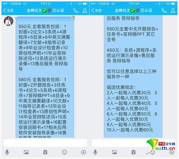 4月中旬,賣家“金牌論文”向張良介紹了“450元”、“550元”、“580元”三套論文代寫方案,其中550元包括“1封面+2論文+3系統(tǒng)+4源程序+5目錄+6中英文摘要翻譯+7文獻(xiàn)+8指導(dǎo)記錄表+9畢業(yè)設(shè)計(jì)檢查表+10原創(chuàng)性聲明+11畢業(yè)答辯陳述詞+12系統(tǒng)運(yùn)行演示錄像+12售后服務(wù) 答辯指導(dǎo)”,580元的服務(wù)增加了“開題報(bào)告”、“答辯稿PPt”、“文獻(xiàn)”、“配置安裝說明書”。賣家還稱,可以保證論文重復(fù)率不超過30%,如果團(tuán)購還有優(yōu)惠,“保證畢業(yè)設(shè)計(jì)隨時(shí)調(diào)試,永久有效”。