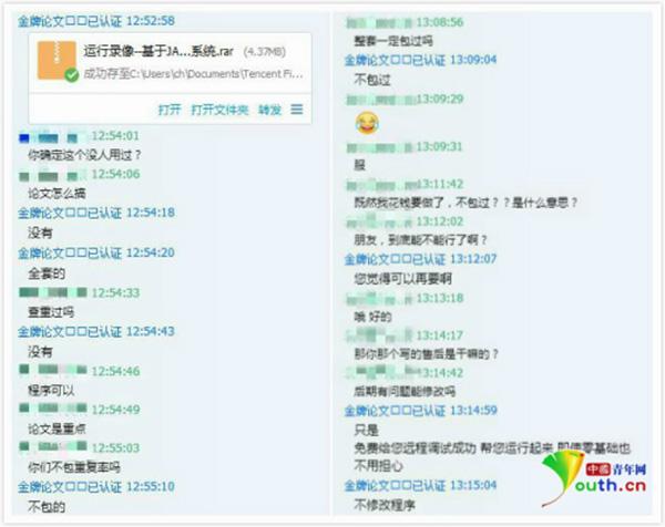 圖為張良提供聊天截圖。根據(jù)張良提供的信息,記者也添加了“金牌論文”QQ,以學(xué)生身份與其交涉,提出想做一套“在線點(diǎn)餐系統(tǒng)”的畢業(yè)設(shè)計(jì)!敖鹋普撐摹痹偃儐栍浾咚诘膶W(xué)校,而后透露他們的論文是買一套刪一套,絕對(duì)避免重復(fù),論文及畢業(yè)設(shè)計(jì)保證“自己原創(chuàng),獨(dú)一無二”。“金牌論文”告訴記者,一般在淡季訂單少時(shí),完成新的論文;旺季時(shí)拿來賣,且論文寫作團(tuán)隊(duì)都是碩士和博士文憑。