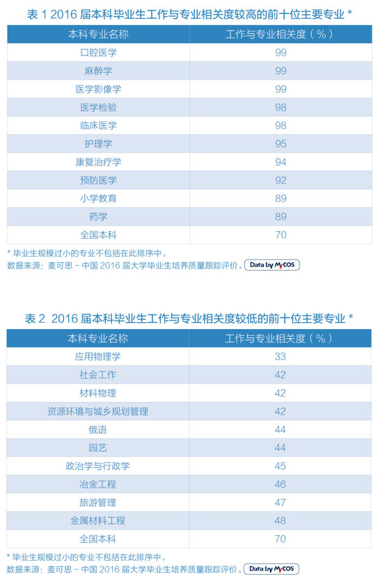 哪些本科專業(yè)從業(yè)門檻較高,讓其他專業(yè)畢業(yè)生涉足難度大?報告顯示,在2016屆本科畢業(yè)生工作與專業(yè)相關(guān)度較高的前十位主要專業(yè)中,醫(yī)學(xué)類專業(yè)占據(jù)較大比重,口腔醫(yī)學(xué)、麻醉學(xué)、醫(yī)學(xué)影像學(xué)的工作與專業(yè)相關(guān)度均為99%。與之形成對比的是,應(yīng)用物理學(xué)的工作與專業(yè)的相關(guān)度較低,僅為33%,緊隨其后的是社會工作、材料物理以及資源環(huán)境與城鄉(xiāng)規(guī)劃管理專業(yè),均為42%。