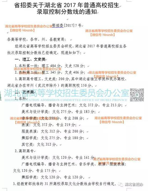 2017年湖北省高考各批次分數(shù)線公布,具體如下: