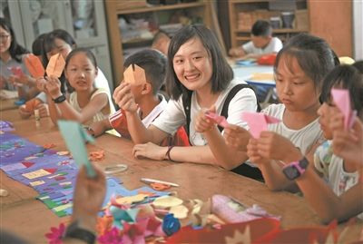 7月25日,大學(xué)生志愿者給江西省南昌市灣里區(qū)太平鎮(zhèn)獅峰學(xué)校的留守兒童們上手工課。 暑假期間,南昌大學(xué)的大學(xué)生志愿者來到地處山區(qū)的太平鎮(zhèn)開展“彩虹工程”暑期夏令營活動,為50多名留守兒童開設(shè)了美術(shù)、音樂、國學(xué)和心理輔導(dǎo)等課程,給山里娃帶來了一個快樂的“彩虹假期”。