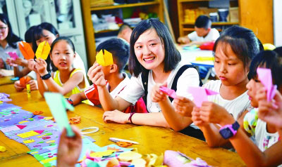 暑假期間,南昌大學(xué)的青年志愿者來到江西省南昌市灣里區(qū)太平鎮(zhèn)開展“彩虹工程”暑期夏令營活動(dòng)。一個(gè)月時(shí)間內(nèi),16名志愿者為50多名留守兒童開設(shè)了美術(shù)、音樂、舞蹈、國學(xué)等課程,豐富孩子們的暑期生活。圖為大學(xué)生志愿者給太平鎮(zhèn)獅峰學(xué)校的孩子們上手工課。新華社發(fā)