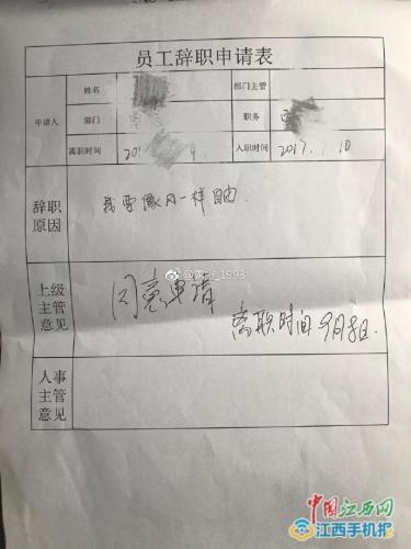 9月21日,記者聯(lián)系上該位博主,博主稱(chēng),公司是做電商的,這封辭職信是個(gè)1998年出生的女生寫(xiě)的,她在公司做客服,是江西人。“她很文靜很漂亮,有1米70,很高!甭秾毟嬖V中國(guó)江西網(wǎng)記者。