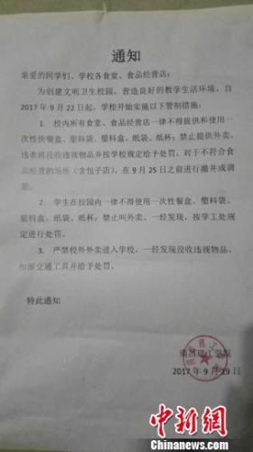 該校在通知內(nèi)容中要求,學(xué)生在校園內(nèi)一律不得使用一次性餐盒、塑料袋、塑料盒、紙袋、紙杯,并禁止叫外賣,一經(jīng)發(fā)現(xiàn),按學(xué)工處規(guī)定進行處罰。同時,也嚴(yán)禁校外外賣進入學(xué)校,一經(jīng)發(fā)現(xiàn)沒收違規(guī)物品、扣留交通工具并給予處罰。