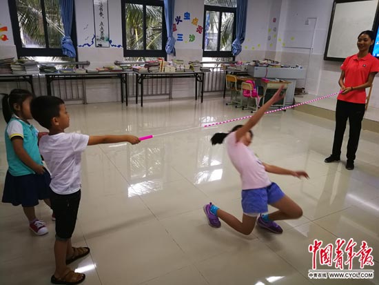 臺風(fēng)要來了,外面雨很大,剛剛師范畢業(yè)的張開利正在帶3個孩子上室內(nèi)體育課。