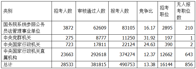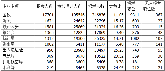 國(guó)稅是招錄大戶,目前共有19萬(wàn)人通過(guò)審核,共有24萬(wàn)人報(bào)名,競(jìng)爭(zhēng)比為11:1,仍有367個(gè)職位無(wú)人報(bào)考。鐵路公安審核通過(guò)人數(shù)位居第二,目前有2.5萬(wàn)人通過(guò)審核,競(jìng)爭(zhēng)比為16:1。值得關(guān)注的是,國(guó)家物資儲(chǔ)備局雖然招錄人數(shù)不是很高,僅有51人,但目前有4236人報(bào)名,3554人通過(guò)審核,競(jìng)爭(zhēng)比高達(dá)70:1。