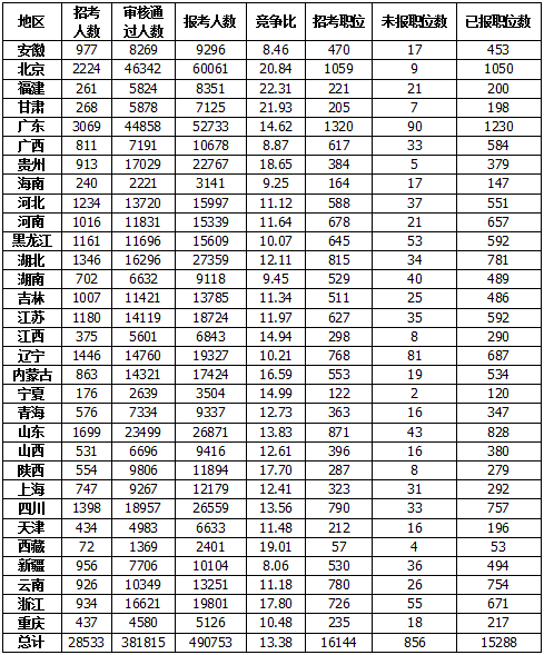 從各地報(bào)名情況來(lái)看,北京、廣東、湖北、山東、四川、貴州、浙江等省份為較熱的地區(qū),報(bào)名人數(shù)較多,與這些地區(qū)招錄人數(shù)多有很大關(guān)系。從競(jìng)爭(zhēng)比來(lái)看,福建目前競(jìng)爭(zhēng)比最高,招錄261人,有8351人通過(guò)審核,競(jìng)爭(zhēng)比為22.3:1,其次為甘肅,北京排第三位。
