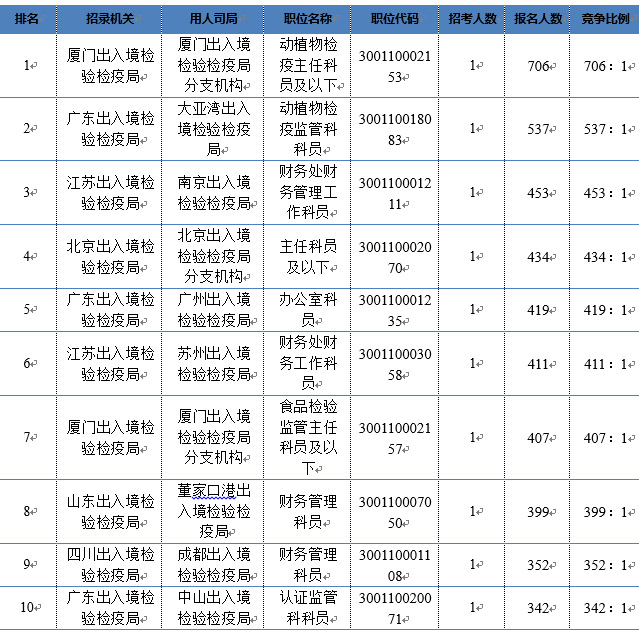 最受考生歡迎的出入境相關(guān)崗位,絕大多數(shù)都位于江浙閩粵京魯?shù)劝l(fā)達地區(qū),雖然已經(jīng)表現(xiàn)出很大的競爭趨勢,但報名人數(shù)一漲再漲。截止到11月5日16:00,廈門出入境檢驗檢疫局分支機構(gòu)動植物檢疫主任科員及以下崗位持續(xù)領(lǐng)跑,成為出入境各部門報名人數(shù)最多、競爭比例最高“雙高”職位,競爭比例攀升至達706:1。大亞灣出入境檢驗檢疫局動植物檢疫監(jiān)管科科員崗位緊跟其后,競爭比例達到537:1。競爭比超過400:1的崗位已經(jīng)達到了7個。具體數(shù)據(jù)可參見表1。