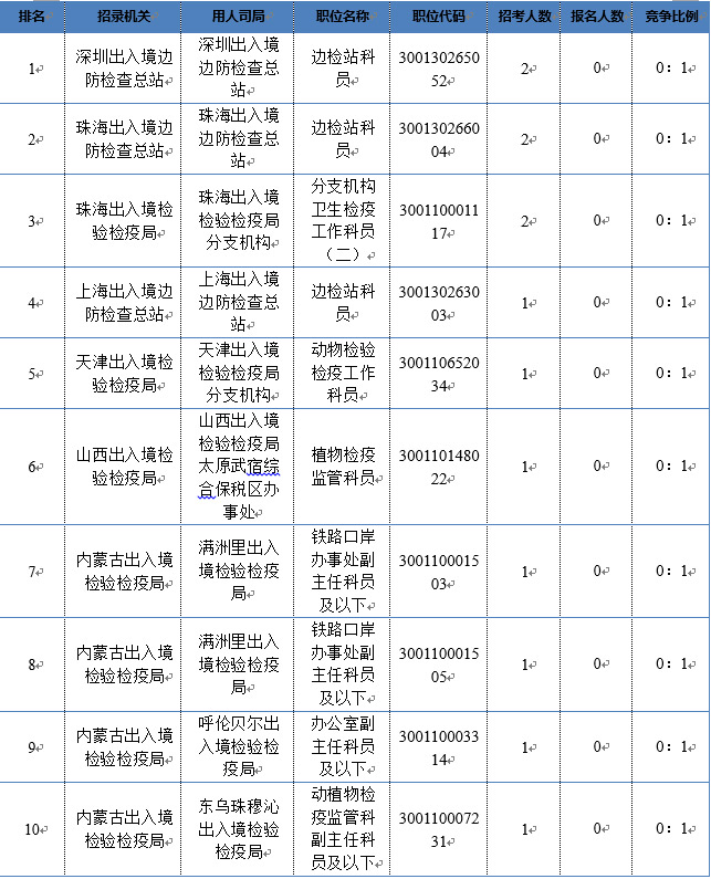 表1 2018年國考出入境各部門競爭最激烈的十大職位(數(shù)據(jù)截至11月5日16:00)