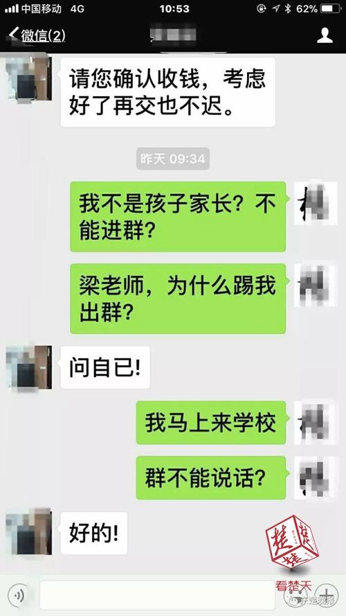 據(jù)梁老師介紹,他不想楊先生的負(fù)能量影響了其他家長,所以將他踢出了群。 該校一負(fù)責(zé)人稱:“這個家長在群里傳播負(fù)能量,講不了幾句話就搞起來,火氣大得很,總懷疑我們搞名堂。我們無法跟他溝通! 他保證,學(xué)校不會因此做出對楊先生女兒任何不利的行為。