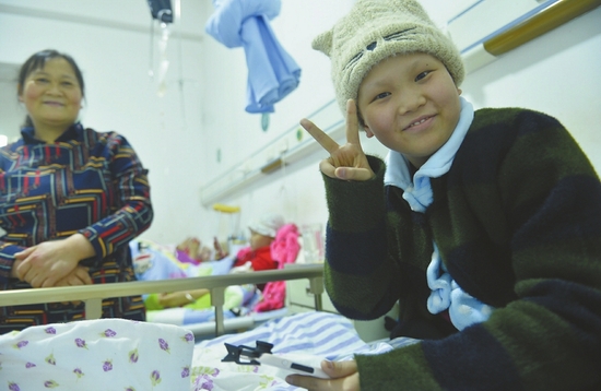 11月21日,醫(yī)院病房,13歲的女孩蒙欣笑對病魔。