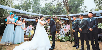 胡喆(右四)和唐瑾(右五)在自家民宿前舉辦婚禮,他們仿佛置身世外桃源,將自己的生活與民宿經(jīng)營很好地結(jié)合在一起。