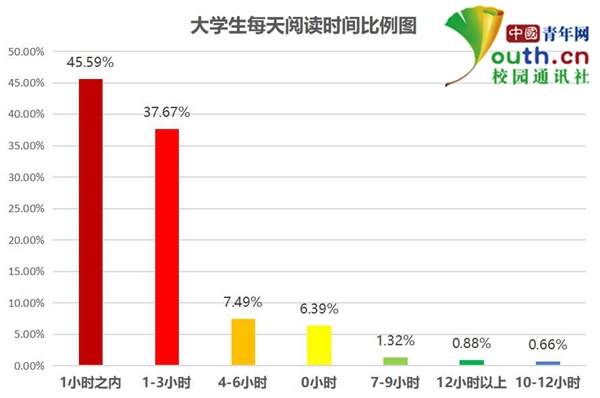 根據(jù)中國青年網(wǎng)記者調(diào)查顯示,每天閱讀時間在1小時之內(nèi)的學生占45.59%,其次為1-3小時、4-6小時,分別占37.67%和7.49%。還有6.39%的大學生每天閱讀時間為0。由此可以看出,51.98%的學生每天閱讀時長不超過1小時。