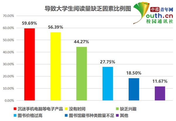 目前,許多大學生表示閱讀情況不容樂觀,那么,是什么因素會導致閱讀量缺乏呢?根據(jù)中國青年網(wǎng)記者調(diào)查顯示,59.69%的學生認為是“沉迷手機電腦等電子產(chǎn)品”,其次“沒有時間”閱讀和“缺乏興趣”,各占56.39%、44.27%。此外,還有18.5%的學生認為“圖書館藏書種類數(shù)量不足”導致閱讀量缺乏。