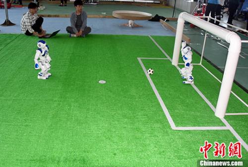 資料圖:2018年3月29日,廈門大學(xué)大學(xué)生創(chuàng)新創(chuàng)業(yè)實踐基地,大學(xué)生團隊演示他們研發(fā)出的機器人足球。 中新社記者 孫自法 攝