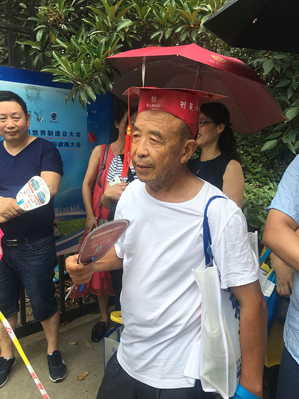 73歲的羅大爺也是送考大軍中的一員,天氣較熱,他瞞著家人來到考場門外,等待正在考試的外孫女!皼]讓他來,自己不放心非要過來,坐了一個多小時公交車!绷_大爺?shù)呐畠赫f。