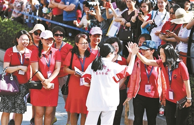 人大附中送考團(tuán)身著紅色“戰(zhàn)袍”為考生送考攝影/本報記者 崔峻