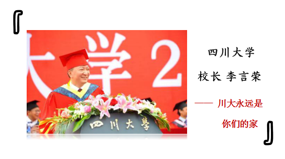 同學們,川大就是你身后的遠景,順境時為你們祝福、為你們高興,逆境時就是你背后的靠椅,給你以支撐。同學們,昨天晚上我在學校BBS上看到一位小哥的留言:藍天在上,黃土在下,若干年后,再約川大!待到那時,都成爹媽,勵志兒女,還考川大!同學們,不管大家今后身在何地、身處何境、身遇何事,川大永遠是你們的家。