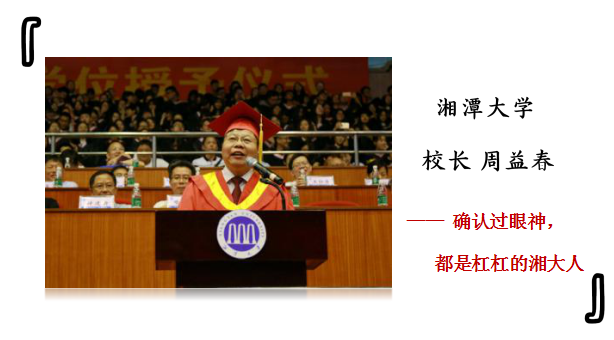 今天在座的你們,陌生又熟悉。陌生的是,我叫不出每個人的名字,說不出每個人的專業(yè);熟悉的是,我們或者在教室聽過課,或者在食堂拼過桌,或者在校園擦肩而過。我想,假如顏值可以當飯吃,你們一定可以養(yǎng)活整個世界!今天,我站在這里,又一次跟大家確認了眼神,你們都是杠杠的湘大人!都是永遠的湘大姑娘、永遠的湘大小伙!
