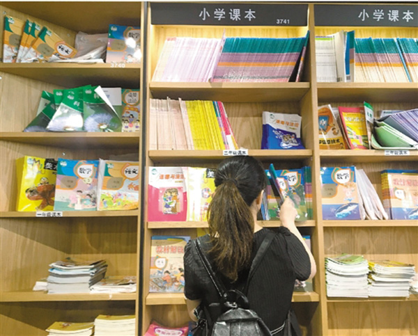 16日下午,小貝媽帶著女兒快步走進(jìn)杭州慶春路購書中心,來不及擦擦汗水,喘幾口氣,她們就根據(jù)提示直奔位于三樓的小學(xué)教材書架。她已經(jīng)在解放路書店逛了一上午,但還是沒找全孩子下學(xué)期要用的課本教材,只好又趕到慶春路購書中心碰碰運氣。