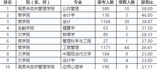 下面,我們就通過(guò)4所熱門(mén)高校報(bào)錄比排名前10的專業(yè)來(lái)看一下那些相對(duì)難考的專業(yè)有哪些: