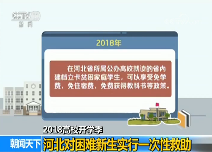 今年,在河北省內(nèi)就讀的河北省建檔立卡貧困家庭學生,可以享受免學費、免住宿費、免費獲得教科書等政策。從2018年秋季學期開始,河北省還對參加高考并被全日制普通高等院校錄取、具有河北省戶籍的家庭經(jīng)濟特別困難學生實行一次性救助。一次性救助標準是每生2000-3000元,主要解決大學新生報到的路費、學校助學金發(fā)放前的生活費等。