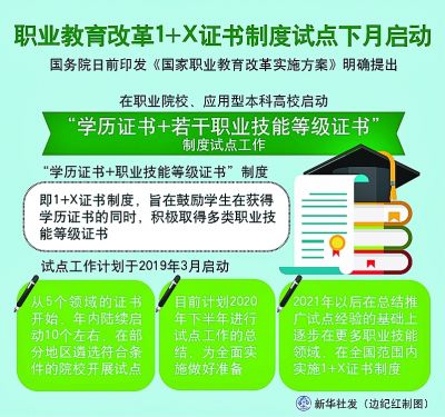 “職教20條”提出,從2019年開始,在職業(yè)院校、應(yīng)用型本科高校啟動“學(xué)歷證書+若干職業(yè)技能等級證書”制度試點(diǎn)(以下稱1+X證書制度試點(diǎn))工作。試點(diǎn)工作要進(jìn)一步發(fā)揮好學(xué)歷證書作用,夯實學(xué)生可持續(xù)發(fā)展基礎(chǔ),鼓勵職業(yè)院校學(xué)生在獲得學(xué)歷證書的同時,積極取得多類職業(yè)技能等級證書,提高就業(yè)創(chuàng)業(yè)本領(lǐng),緩解結(jié)構(gòu)性就業(yè)矛盾。