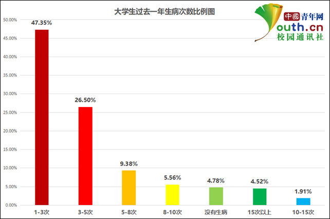 根據(jù)中國(guó)青年網(wǎng)記者調(diào)查顯示,在過去一年里,有73.85%的大學(xué)生生病1-5次,常見的健康困擾主要是口腔潰瘍、長(zhǎng)痘和脫發(fā),分別占62.26%、55.34%和35.01%。