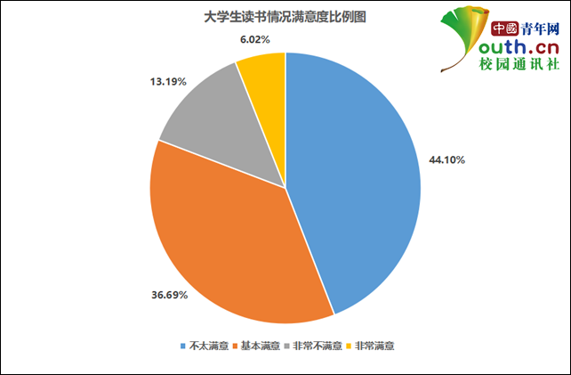 調查顯示,有44.1%的受訪學生對自己讀書情況不太滿意,36.69%的受訪學生基本滿意,認為非常不滿意和非常滿意的分別為13.19%和6.02%。