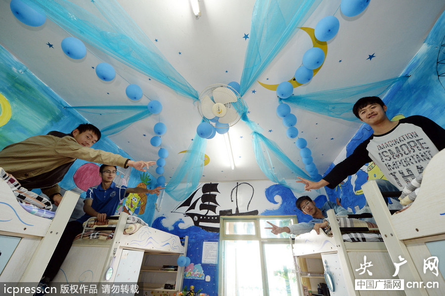 2013年10月26日,重慶西南大學(xué)學(xué)生會(huì)舉辦了一場(chǎng)新生宿舍美化大賽,數(shù)以千計(jì)的新生參與。許多創(chuàng)意獨(dú)特的95后,花了不到200元,就把寢室裝出了高端洋氣上檔次的格調(diào)。卡通賣萌、奇幻漂流、文藝范兒……來(lái)看看他們的宿舍風(fēng)格與背后的故事吧?蓯劭ㄍ▔γ咳擞忻让奚幔航(jīng)濟(jì)管理學(xué)院工商管理專業(yè)大一男生宿舍竹園C棟316室花費(fèi):不超過(guò)100元,主要花費(fèi)在顏料紙張上畫著卡通小黃人的墻、維尼熊馬克杯、小螞蟻粉T恤……若不是墻角散落著的幾只略有味道的球鞋,你很難將眼前這間宿舍與男生聯(lián)系在一起。這間宿舍萌至如此,必須歸功一個(gè)人:宿舍的賣萌小王子詹鑫豪。自打入校的第一天起,發(fā)嗲、買各類賣萌產(chǎn)品……詹同學(xué)盡顯賣萌本色。在他的影響下,宿舍其他5個(gè)哥們也發(fā)現(xiàn)了自己的賣萌天分,集體賣萌成了宿舍的風(fēng)氣。比如:大家集體購(gòu)買了一系列風(fēng)格迥異的卡通睡衣,包括奶牛版、熊貓版等;再比如,大家有了一個(gè)個(gè)超萌的外號(hào):大狼、肥羊、猴子、毛毛、嚶。在寢室美化設(shè)計(jì)時(shí),詹鑫豪出力不少。“我們計(jì)劃在墻上畫點(diǎn)東西,但別的東西都好難畫,我突然想到近期看的動(dòng)畫片《卑鄙的我》里的小黃人,不是正好又萌又簡(jiǎn)單嗎?”全宿舍一致認(rèn)可這個(gè)提案,詹鑫豪更主動(dòng)承擔(dān)起為小黃人上色的任務(wù)。自稱“不擅賣萌”的周密同學(xué)表示,“相比很多同齡人,我們宿舍顯得比較幼稚。但用萌這種方式記錄生活,算是青春記憶吧!弊霞喪酵挷璧纴(lái)相伴宿舍:外國(guó)語(yǔ)學(xué)院免師英語(yǔ)專業(yè)大一7班女生宿舍桃園1棟201室花費(fèi):不超過(guò)200元,主要用于買卡通畫和紫紗擁有一個(gè)童話古堡,是萬(wàn)千少女的夢(mèng)想,英語(yǔ)班的幾位同學(xué)把它變成了現(xiàn)實(shí)。最初,室長(zhǎng)吳倩一提議走公主風(fēng),立馬獲得壓倒性的支持。此后給宿舍起名字、設(shè)計(jì)細(xì)節(jié)等,遇到意見不一致時(shí),都是以少數(shù)服從多數(shù)為原則,“但有一點(diǎn):不能放馬后炮!备髯砸鹿裆系木S尼熊、米老鼠,搭在蚊帳上的層層紫色紗布,甚至在廁所門前專門貼了一張公主畫……公主風(fēng)鋪天蓋地而來(lái)。這間宿舍在全院打響名號(hào),除了夢(mèng)幻的布置,還離不開室友袁凡的宣傳。宿舍里兩套精致的茶幾頗引人注目,它們的主人、被同學(xué)們盛贊為“茶神”的妹子來(lái)自云南,家鄉(xiāng)盛產(chǎn)普洱茶,“我們家很多人是茶文化愛好者。我平時(shí)泡了茶,就會(huì)喊大家來(lái)喝,享受泡茶、品茶的過(guò)程!睍r(shí)光軸愛上照片墻宿舍:經(jīng)濟(jì)管理學(xué)院農(nóng)業(yè)經(jīng)濟(jì)管理大一1班女生宿舍南苑9舍525室花費(fèi):不超過(guò)200元,錢主要用在購(gòu)買顏料、卡紙等上愛拍照、愛旅游、愛泡咖啡館……在王麗君看來(lái),宿舍姐妹們雖然性格有靜有動(dòng),但或多或少都有顆文藝的心。這也很好地解釋了為什么舍長(zhǎng)宋錦雯一提議宿舍美化走文藝范,大家都舉雙手贊成!安蝗绾腿巳司W(wǎng)一樣,我們也建一個(gè)實(shí)體版的時(shí)光軸”、“不如我們貼上黃色的墻紙,讓宿舍看起來(lái)像個(gè)咖啡館”……確立主題后,舍友們你一言我一語(yǔ)開始構(gòu)思細(xì)節(jié)。很快,時(shí)光軸火速出爐,事后它確實(shí)成為了宿舍的一大標(biāo)志。時(shí)光軸的主材料是涼席和各張打印出來(lái)的照片以及文字解說(shuō)。時(shí)光軸上,記錄了大家相處的兩個(gè)多月美好時(shí)光。王麗君向記者介紹,“第一張是軍訓(xùn)開始前在宿舍的第一張合影,第二張是軍訓(xùn)拉練時(shí)我們疲憊狀態(tài)下的自拍,第三張是班級(jí)第一次聚餐,我們宿舍的坐在一起……”談起“時(shí)光軸”的未來(lái),王麗君表示,“我們都是自拍狂,也特別喜歡記錄生活的點(diǎn)點(diǎn)滴滴,所以未來(lái)肯定會(huì)有更多精彩照片,我們還會(huì)分享出來(lái),當(dāng)然那時(shí)我們可以選擺更美的照片!
