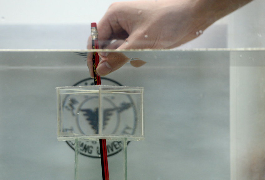 10月31日,浙江大學陳紅勝教授研究團隊工作人員演示一件“隱身”裝置的效果。當一支鉛筆被放入該裝置中時,鉛筆的中間部位“不見了”,但該部位的背景圖案仍然可見。新華社記者韓傳號攝