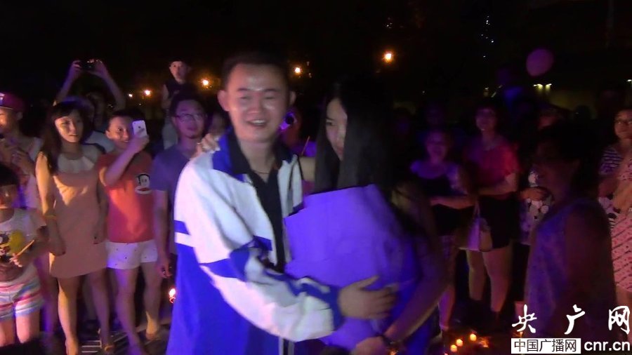 7月22日晚上8點(diǎn)28分,在南京鼓樓區(qū)濱江外灘廣場上演了浪漫的一幕:200根蠟燭擺出巨大的心形表達(dá)愛意,一旁碩大的“7.22”象征男主角毛先生女友的生日,周圍圍著一大幫親友。在閨蜜的引導(dǎo)下,被蒙上眼睛的女主角李小姐走下出租車,摘下眼罩的瞬間,事先毫不知情的她被這場面深深感動(dòng)了,眼淚止不住流下來。