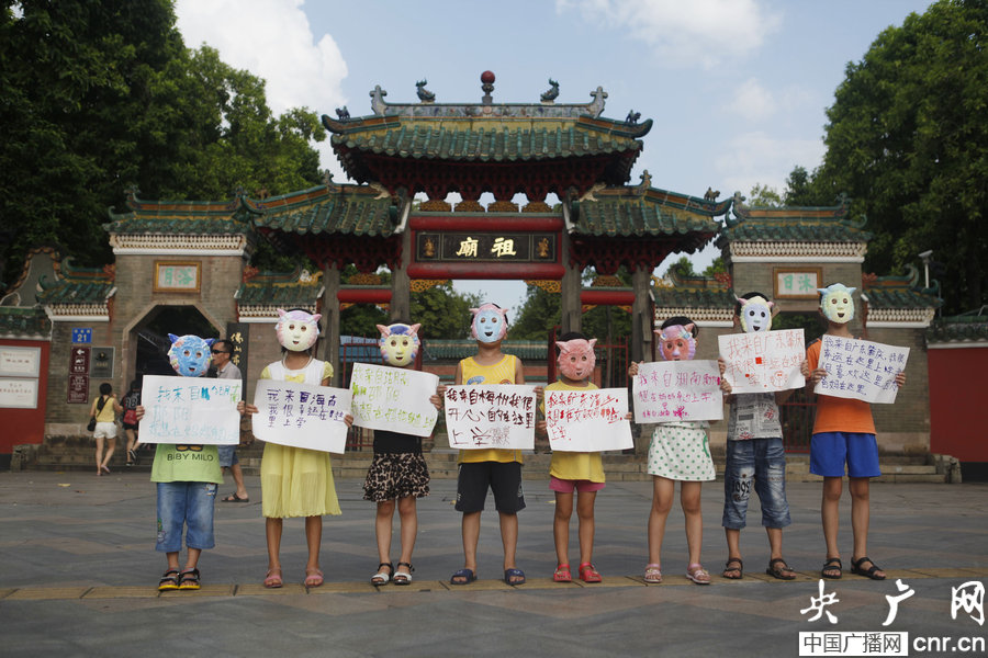 2014年8月28日,佛山,“我多想,有一個穩(wěn)定的家有你陪伴,有你的愛和溫暖……”昨日,隨著音樂響起,8位“小候鳥”帶著自制的美羊羊面具,手持心愿卡出現(xiàn)在鬧市,用歌聲吸引不少路人駐足。他們都是外來工家庭的孩子,在回鄉(xiāng)上學之際,希望用街頭行為藝術(shù),訴求不想回家、想留在父母身邊上學的愿望。