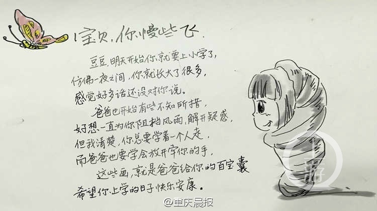 “豆豆,明天開(kāi)始你就要上小學(xué)了,仿佛一夜之間,你就長(zhǎng)大了很多……這些畫(huà),就是爸爸給你的百寶囊……”重慶6歲女孩豆豆該上小學(xué)了,豆豆爸用一組“滿滿都是愛(ài)”的手繪圖,畫(huà)出了對(duì)女兒的叮囑和期望。網(wǎng)友:好暖,別人家的爸爸……