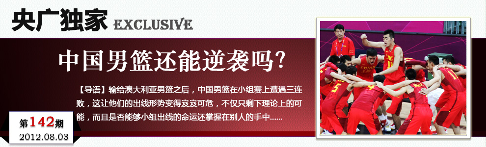 中國男籃以61比81負于澳大利亞隊遭遇小組賽三連敗后,姚明對比賽發(fā)表了看法,“中國隊手感太不好,第四節(jié)一下被對手領(lǐng)先十幾分,這就沒戲了!”輸?shù)舫鼍的關(guān)鍵一戰(zhàn)后,男籃命懸一線。最后一輪對陣英國隊,姚明稱:“得死揍他們了!”【詳細】