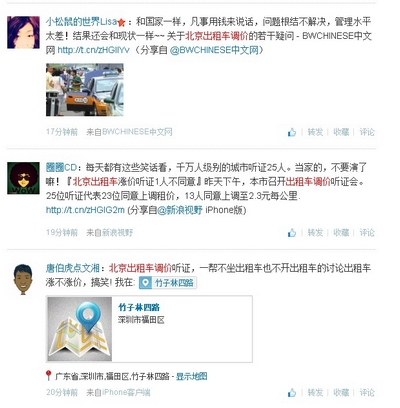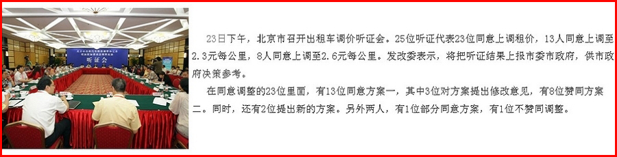 對于北京出租車調(diào)價一事,市發(fā)改委副主任劉印春表示,下一步,將把聽證會上的意見建議向市委市政府匯報,作為價格調(diào)整工作決策重要的參考,最終由市政府決策。不過北京北京出租車的調(diào)價幾乎已成定局。 25位代表,明確表示反對意見的僅有1人。是漲價切實應(yīng)該?微博上對于出租車漲價持反對意見的聲音卻明顯與聽證結(jié)果不同。多位網(wǎng)友與評論員均認為,出租車司機收入低,根源并不在低價上,漲價也不能理想化的解決所有問題。這幾乎成了微博上的主流聲音。那么,為何聽證會的結(jié)果會同這些聲音出現(xiàn)“岔路”? |