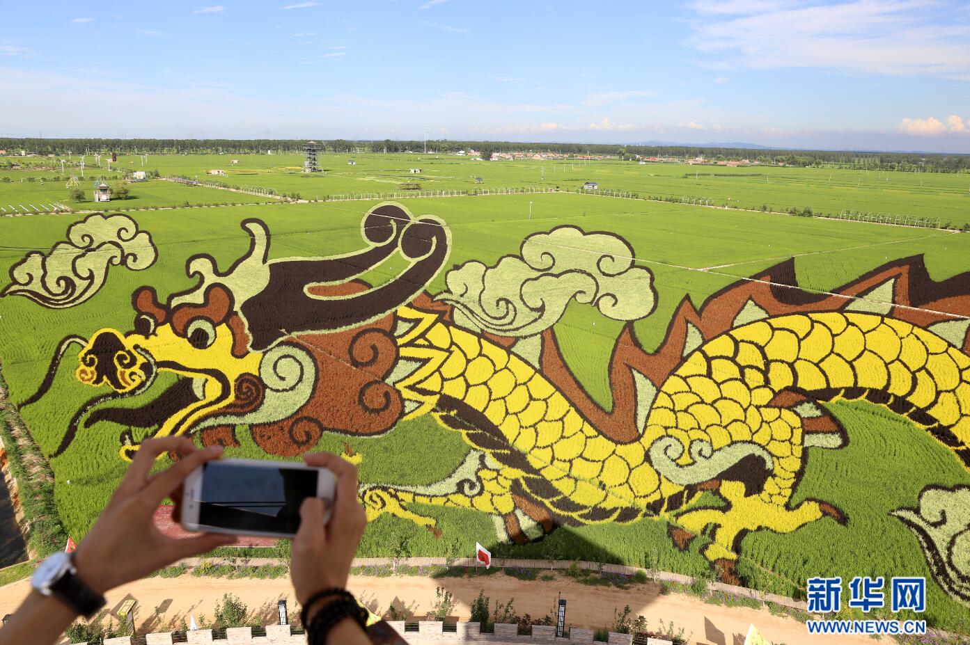 7月24日,一位游客在拍攝稻田畫《見龍?jiān)谔铩。新華網(wǎng) 姜冰攝 -