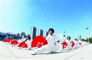 沈陽市跆拳道協(xié)會會員表演太極扇 展演隊伍中人數(shù)最多的,還是群眾體育團(tuán)隊。作為群眾體育一項重要的健身成果,廣場舞已經(jīng)從中國走向世界,活動現(xiàn)場,在優(yōu)美的舞曲聲中,廣場舞團(tuán)隊翩翩起舞;健步走是近年來群眾喜聞樂見的運(yùn)動方式,在活動現(xiàn)場,健步走團(tuán)隊就為人們展示了遼沈群眾的風(fēng)采;秧歌是東北地區(qū)的特色,如今秧歌也與群眾體育融為一體,活動現(xiàn)場,在威風(fēng)鑼鼓的伴奏下,健身秧歌隊伍載歌載舞,表現(xiàn)出了極佳的精神風(fēng)貌; 手拍鼓或許并不難學(xué),但數(shù)百人一起表演卻不容易,活動現(xiàn)場,手拍鼓團(tuán)隊動作整齊劃一,讓人嘆為觀止。太極扇是展演的高潮部分,背景音樂是鏗鏘有力的《中國功夫》,讓所有人的心仿佛都跟著一起跳動。 -