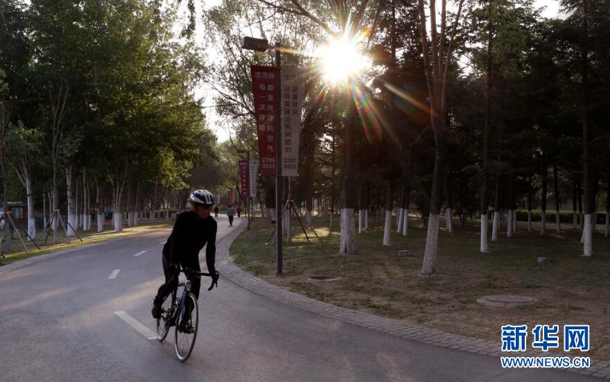 初夏的沈陽(yáng)市陽(yáng)光和煦 ,氣候宜人,位于沈陽(yáng)市渾河畔的奧林匹克公園風(fēng)景如畫,每天都吸引大量市民前來(lái)賞景、晨練、垂釣,這里已成為城市中一道靚麗的風(fēng)景線。圖為一位市民清晨在公園內(nèi)騎行。新華網(wǎng) 姜冰攝 -