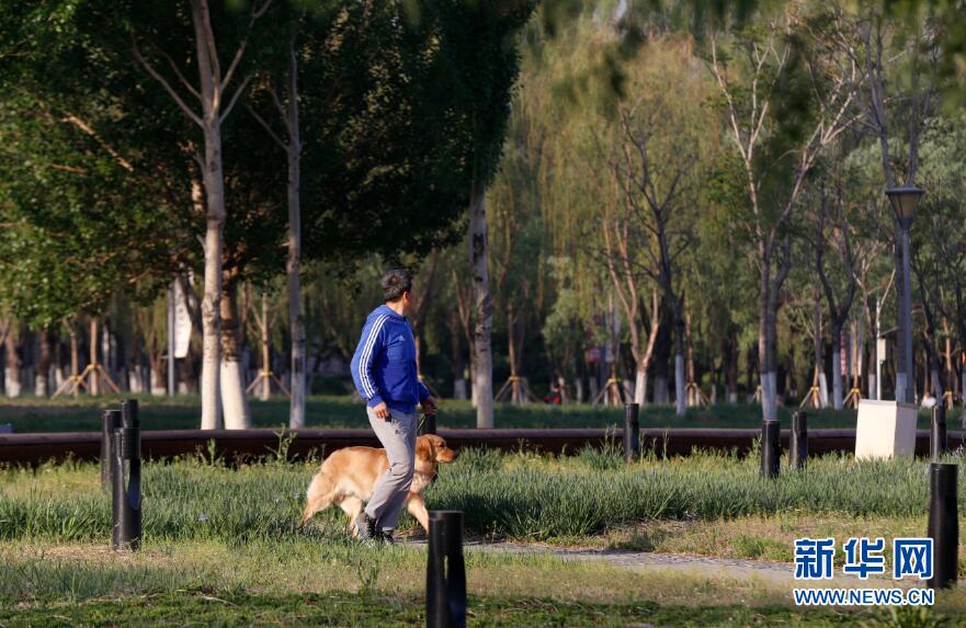 初夏的沈陽(yáng)市陽(yáng)光和煦 ,氣候宜人,位于沈陽(yáng)市渾河畔的奧林匹克公園風(fēng)景如畫,每天都吸引大量市民前來(lái)賞景、晨練、垂釣,這里已成為城市中一道靚麗的風(fēng)景線。圖為市民帶著寵物在公園中散步。新華網(wǎng) 姜冰攝