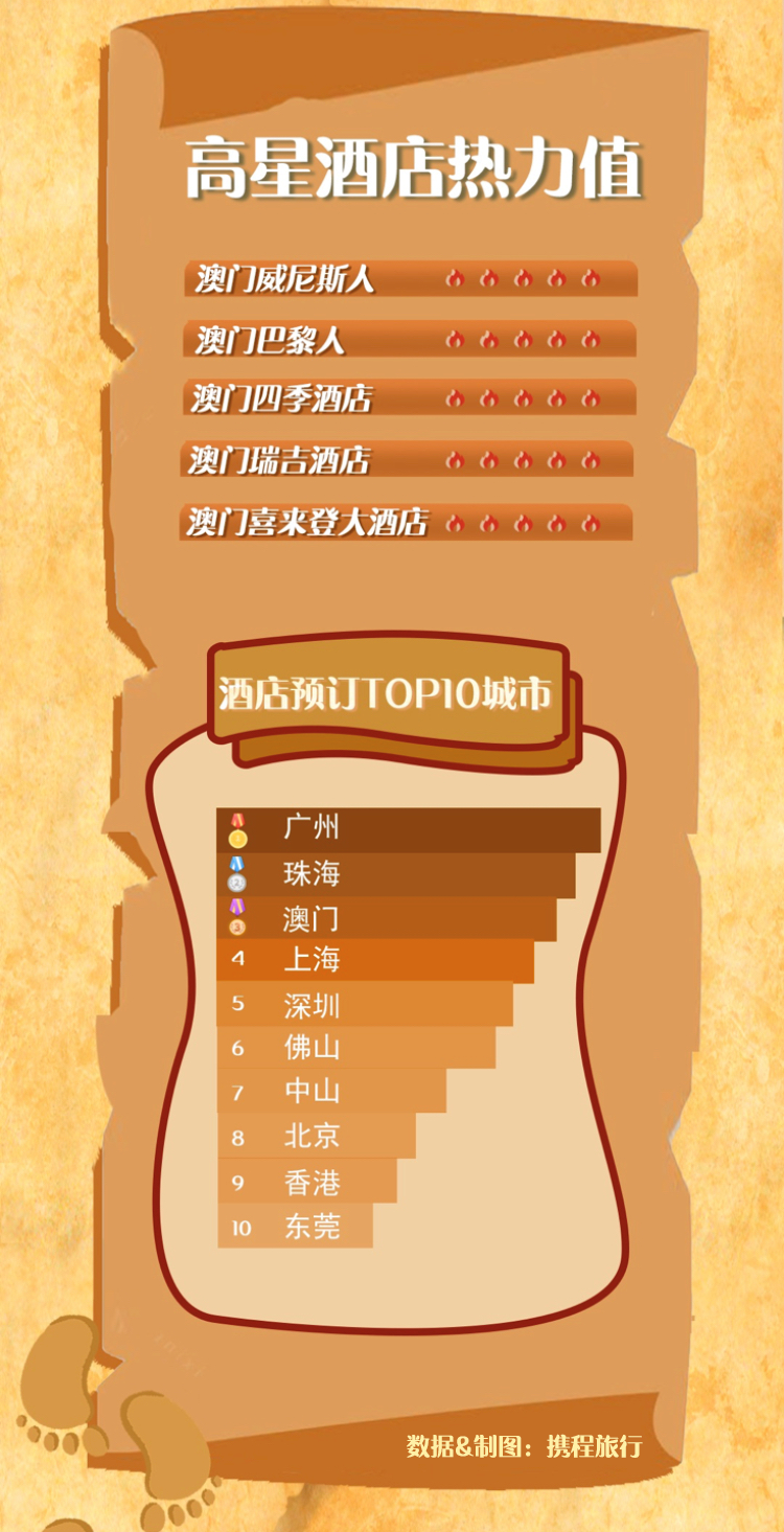 寶藏之城蘊藏密碼,找到澳門的寶藏酒店就是第一步。攜程數(shù)據(jù)顯示:澳門威尼斯人、澳門巴黎人、澳門四季酒店、澳門瑞吉酒店、澳門喜來登大酒店是用戶預(yù)訂熱門酒店。廣州、珠海、澳門、上海、深圳、佛山、中山、北京、香港、東莞等城市的游客是澳門酒店預(yù)訂的主力軍。