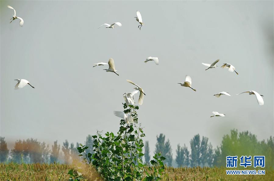 9月7日,一群白鷺在河北省青縣流河鎮(zhèn)田野上空飛翔。白露時(shí)節(jié),河北省青縣流河鎮(zhèn)玉米長(zhǎng)勢(shì)喜人,數(shù)十只白鷺在此覓食嬉戲,成為田野中一道亮麗的風(fēng)景線。 新華社記者 牟宇 攝